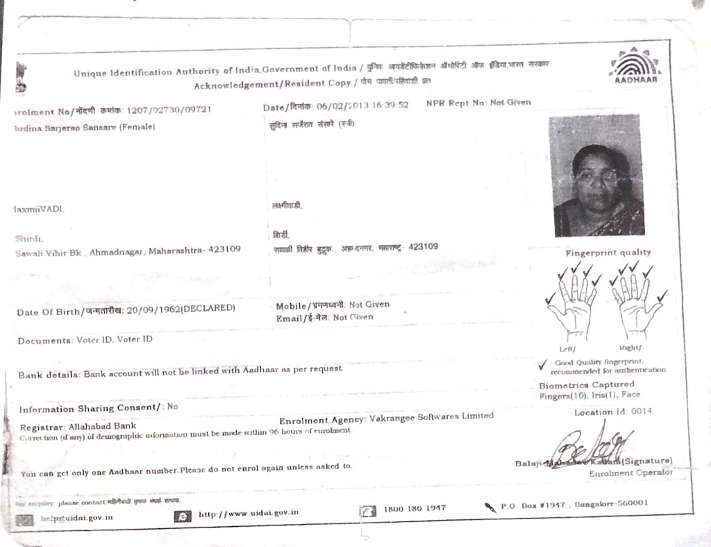जब अपने परिवार के सभी के आधारपत्र बने है और एकाद सदस्य का आधारपत्र नहीं बन रहा है। ऐसे मामले के दो केस स्टडी हमारे पास है। एक है जिस महिला का आधारपत्र इसलिए नहीं बन पा रहा है ,क्यू के उनके हाथ के छाप पर उनके पिता का आधारपत्र रजिस्टर हुवा है। इस महिला ने चार बार अपने आधारपत्र के लिए आवेदन दिया है। पर सारे प्रयास असफल रहे। अब इस महिला ने दो बार अपने पति के नाम के साथ दो बार पिता के नाम के साथ आधार बनवाने की सारे प्रयास असफल रहे। अब पति की पेंशन मिलती है। एक आँख का ऑपरेशन हुवा है। दूसरी आँख है। हाथो के छाप पिताके आधार के साथ जुड़े है। जाये तो कहा जाए ?